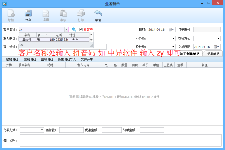 (廣告公司管理軟件-業(yè)務(wù)開單送貨開單界面)