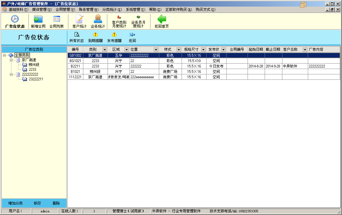 如戶外廣告、 樓宇廣告、 電梯廣告、高速廣告等廣告位管理,和客戶 往來訂單收款功能